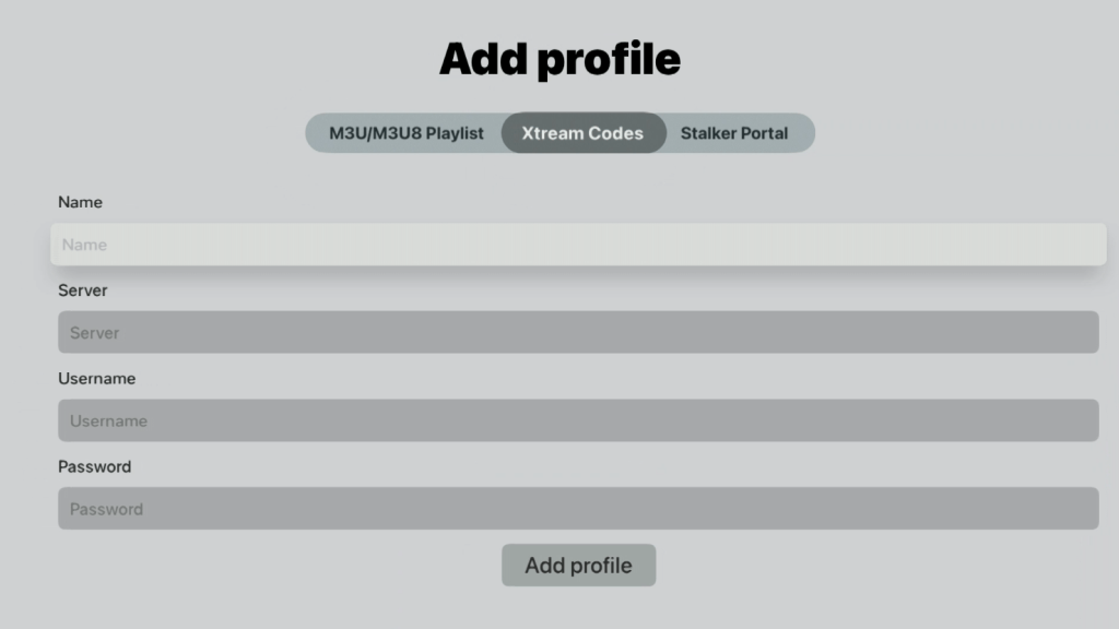 Vælg “Xtream Codes”, som er den midterste mulighed på billedet nedenfor. I feltet “Navn” skal du skrive “Express Iptv /”. I feltet “Server” skal du udfylde din portal-URL, som du modtager fra os under den gratis prøveperiode eller købet. Tryk derefter på knappen “Tilføj profil”.
